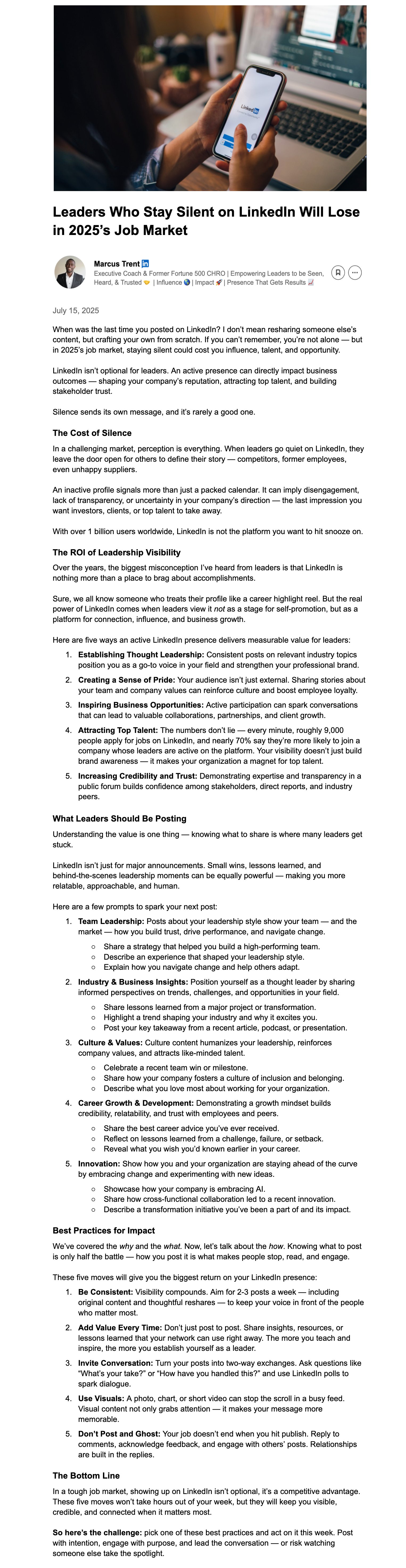 Objective: Position Marcus as a trusted advisor to senior leaders on the strategic value of visibility in a competitive job market. Challenge executives to view LinkedIn as a leadership tool, not just a social platform, and provide them with actionable steps to enhance their presence.