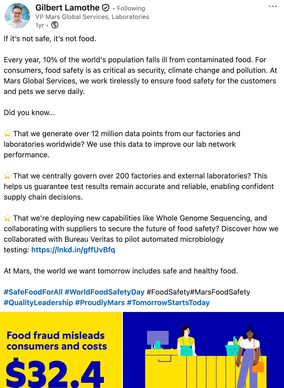 Through strategically crafted LinkedIn posts, I highlighted Mars’ commitment to product integrity and showcased how Gilbert’s team drives these efforts forward.